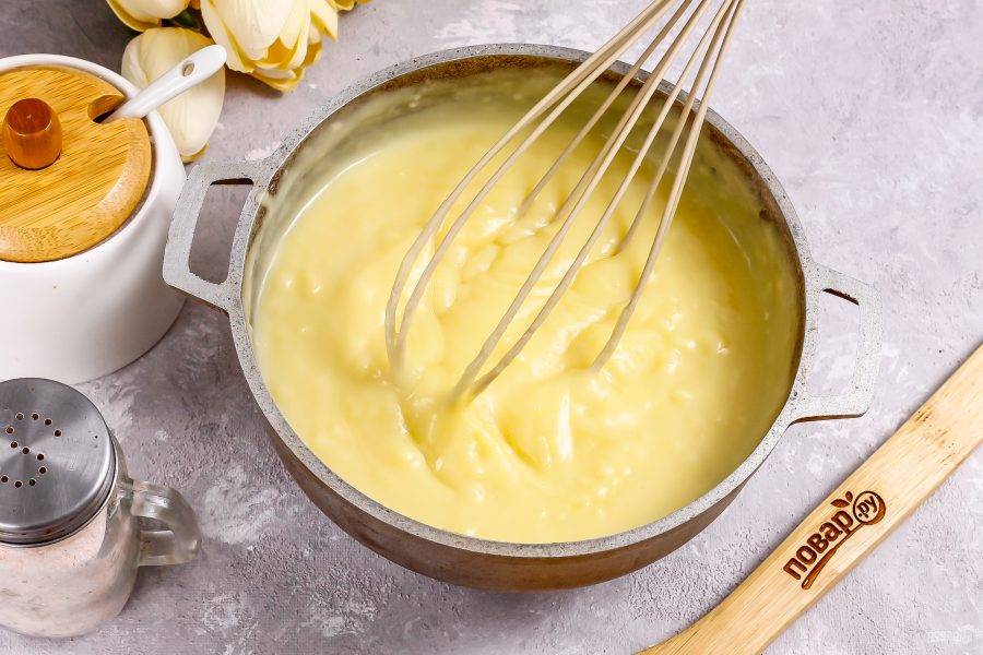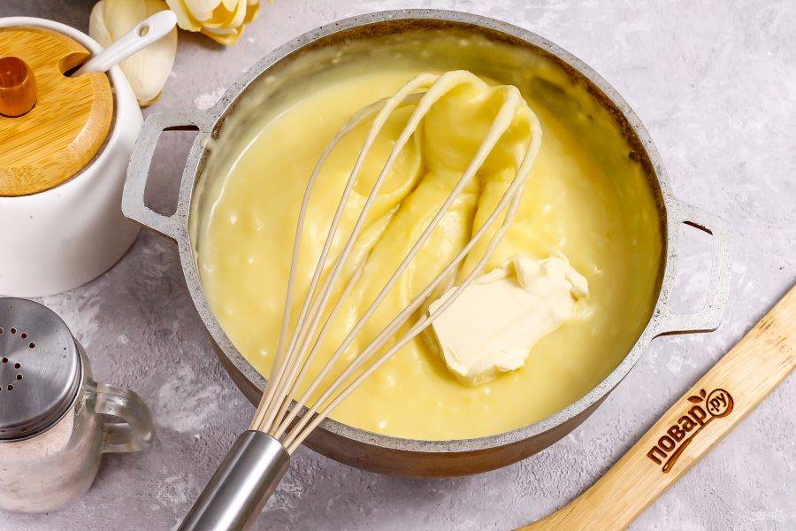 Вмешайте в крем сливочное масло и остудите, накрыв пищевой пленкой.