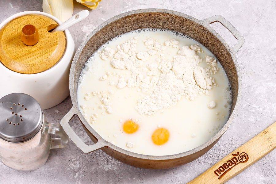 В это время смешайте в казане или в кастрюле с антипригарным дном холодное молоко, сахар, пшеничную муку и выложите туда два желтка куриных яиц. Аккуратно взбейте и поместите емкость на плиту, включая умеренный нагрев.