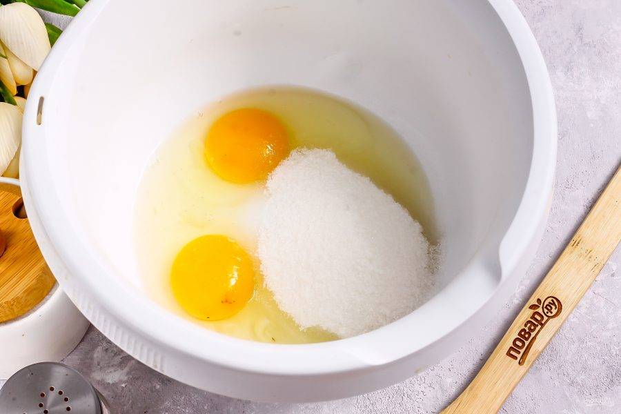 В емкость кухонного комбайна вбейте два куриных яйца, всыпьте соль и сахар. Взбейте все примерно 3-5 минут в пышную пену.