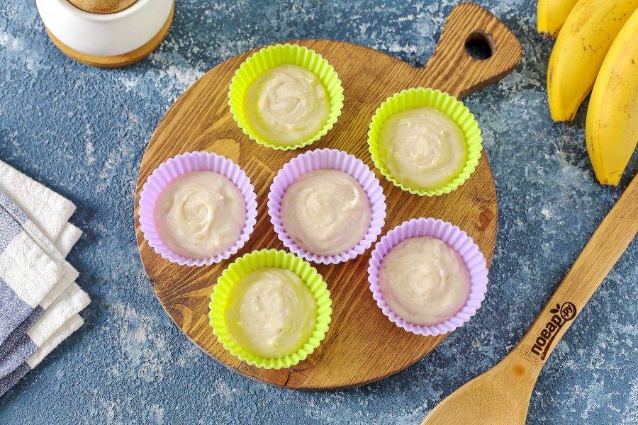 Разложите тесто по формочкам, заполняя их примерно на 2/3 и выпекайте в духовке при температуре 180 градусов 20-25 минут.