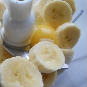 1. Бананы необходимо почистить и нарезать кружочками. Взбить (измельчить) их в блендере вместе с яйцами.