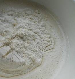 3. Влить кефир, перемешать и постепенно добавить всю муку, просеивая ее через сито. Тесто будет готово, когда получится консистенция наподобие густой сметаны.