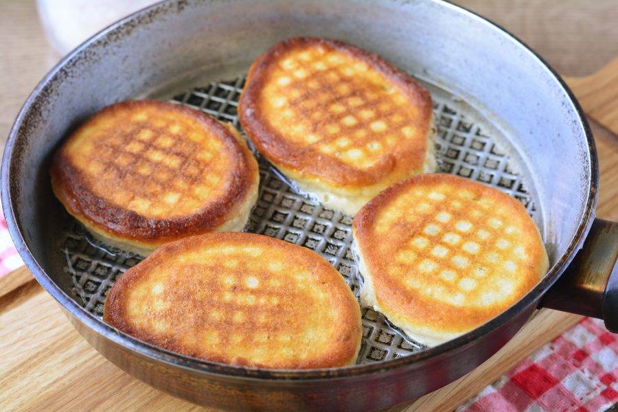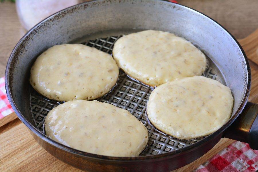 Через 2-3 минуты переверните оладушки, жарьте с обратной стороны столько же времени, пока они не подрумянятся.