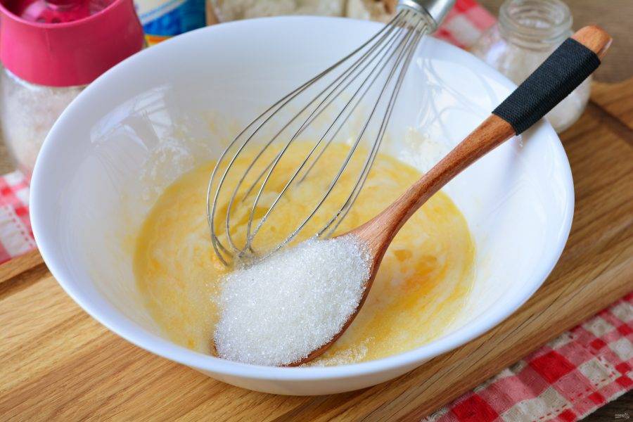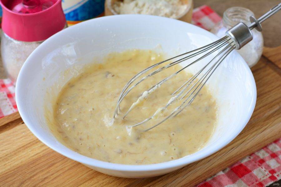 Полностью замесите тесто для оладий. Хорошо перемешивая, чтобы тесто получилось не сильно жидким, но и не густым.