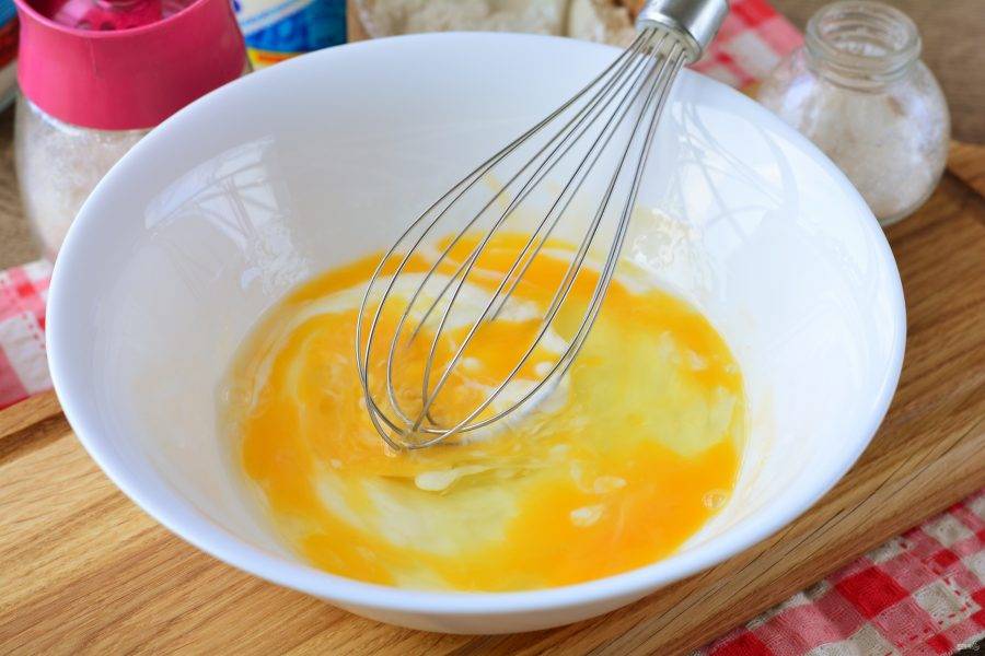 Смешайте в миске яйца и сметану при помощи венчика. Всыпьте щепотку соли.