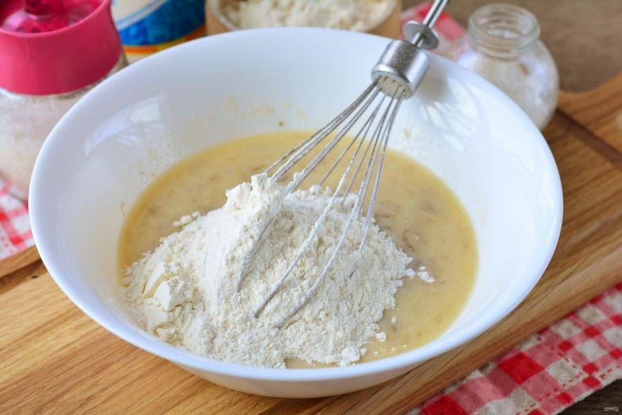 Добавьте банановое пюре в тесто, размешайте, чтобы не было больших комочков.