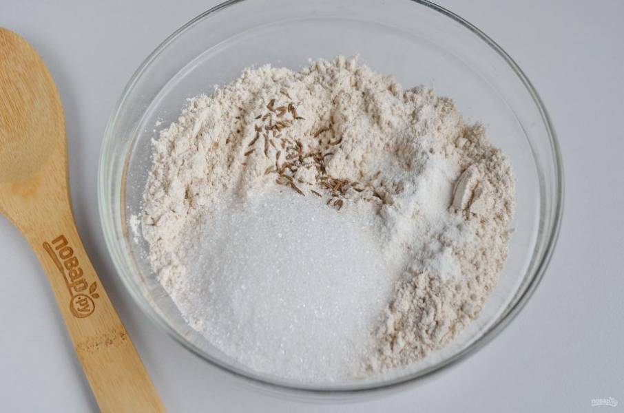 Смешайте цельнозерновую муку с сахаром, солью, содой и семенами тмина.