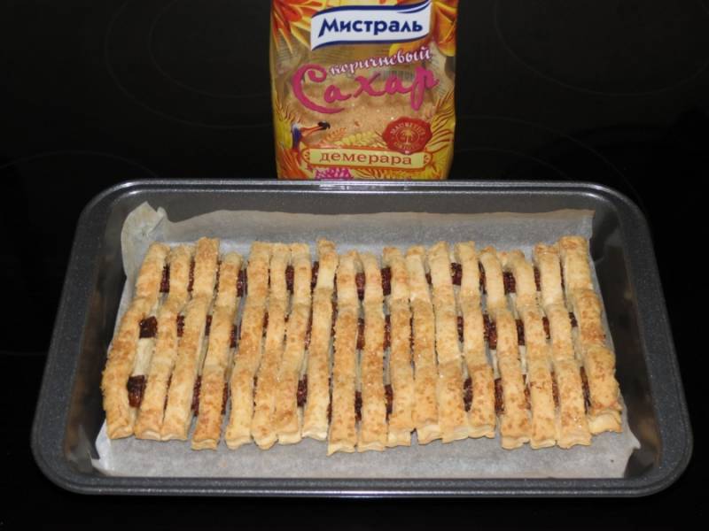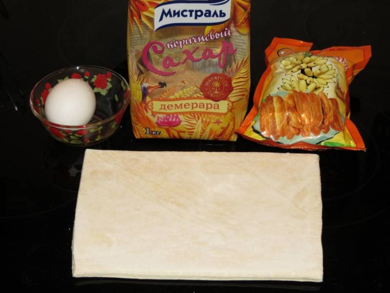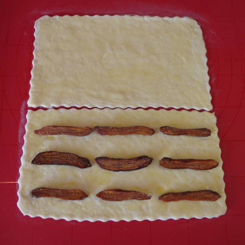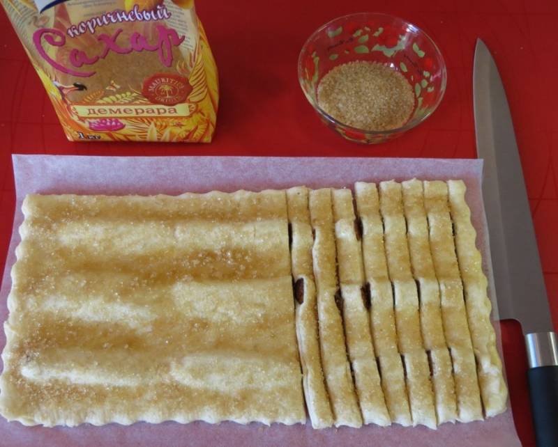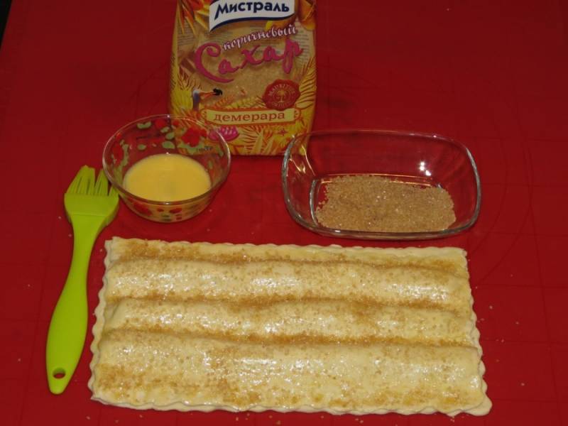 Тесто разморозить при комнатной температуре, раскатать толщиной в 3 мм. Разрезать пласт на 2 равные части. Смазать их желтком.