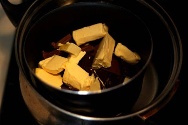 Измельчаем шоколад и вместе со сливочным маслом растопим на водяной бане. Помешиваем, чтобы масса стала однородной.