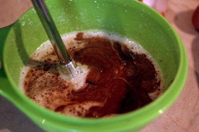 В шоколадную массу добавляем взбитые яйца, муку с какао. Хорошенько перемешиваем, чтобы получилось тесто без разводов, однородного цвета и консистенции.