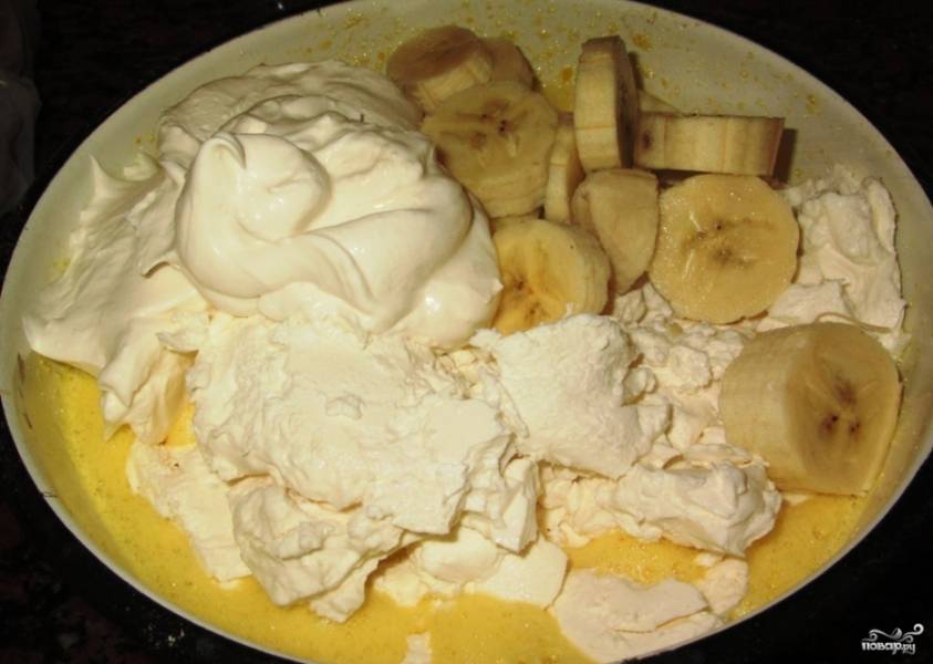 Взбейте яйца и оставшийся сахар. Соедините их с творогом и кусочками банана. Добавьте мед и сметану. Взбейте массу в блендере до единой консистенции или помните вилкой.