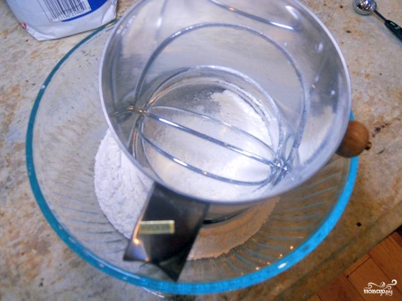 Отдельно просейте муку, добавьте пекарский порошок и соль.