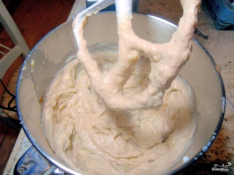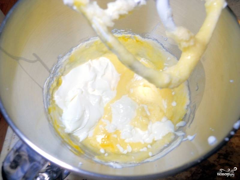 Взбейте сахар с размягченным маслом сливочным, потом поочередно добавьте яйца, затем — сметану и ванильный экстракт. Все перемешайте.