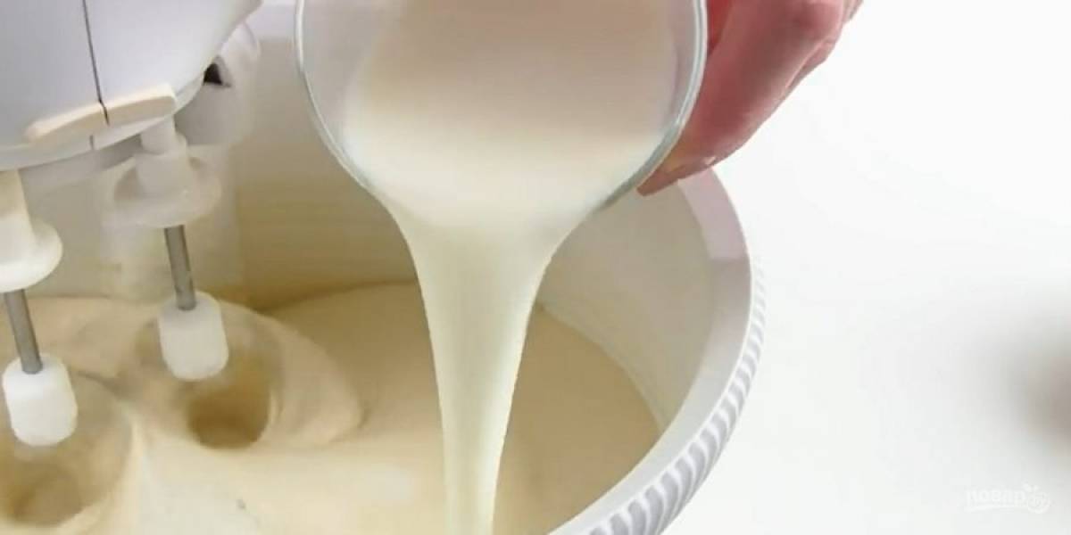 2. Добавьте растопленное и слегка остывшее сливочное масло. Чередуя, добавьте в несколько приемов муку с разрыхлителем и молоко.