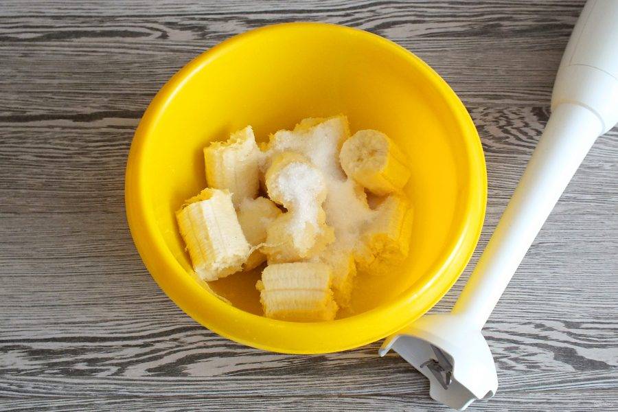 В чашу выложите банан, сахар, ванильный экстракт. Пробейте блендером до состояния пюре.