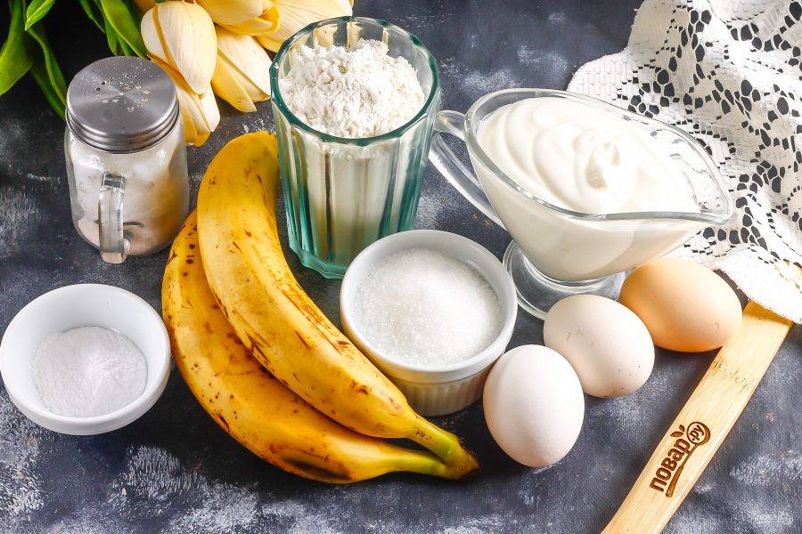 Бананы очистите от кожуры и нарежьте слайсами, ломтиками. На каждый корж нанесите сметанный крем, затем выложите банановую нарезку. И так до верха. Поместите собранный торт в холодильник минимум на 30-40 минут. Верхний слой бананов смажьте лимонным соком, чтобы он не потемнел.