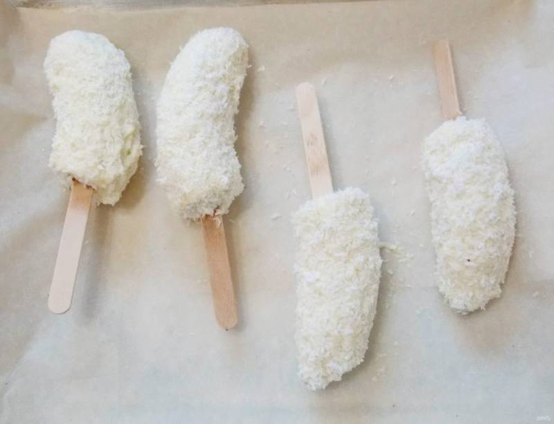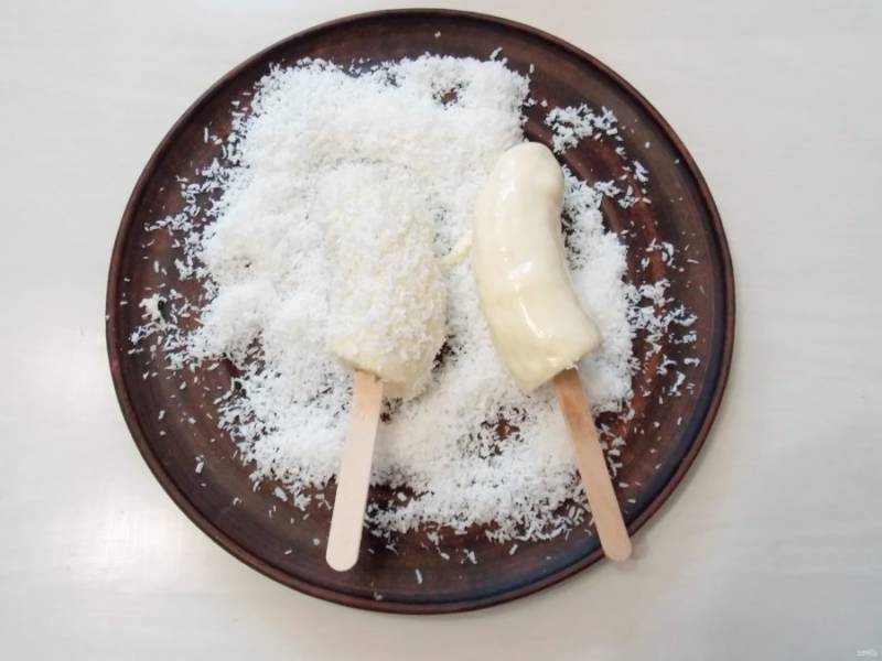 Дайте немного схватиться шоколаду и обваляйте бананы в кокосовой стружке.
