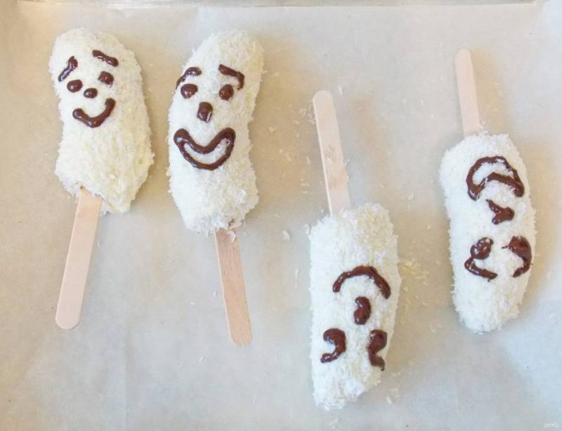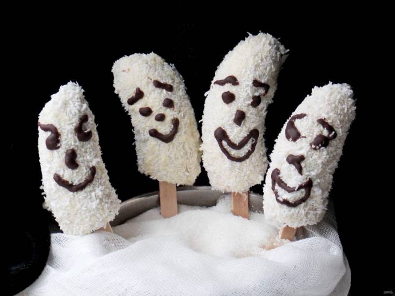 Даже обыкновенные фрукты можно представить в другом свете. И любой, даже очень капризный ребенок, не откажется от таких бананов-привидений. Тем более, что они похожи на мороженое.