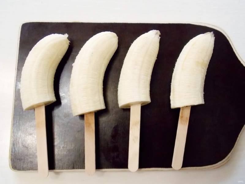 Бананы сполосните, вытрите и очистите от кожуры. Разрежьте их на две части поперек и вставьте полоски со стороны разреза.