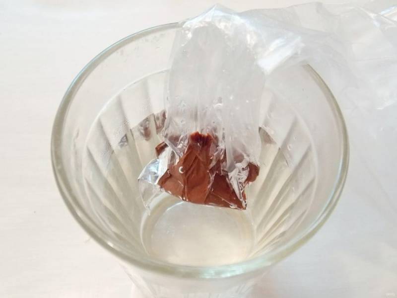 Темный шоколад поломайте и положите в пакет в один угол. Нагрейте воду практически до кипения и опустите пакет с шоколадом. Держите до тех пор, пока шоколад не растает.