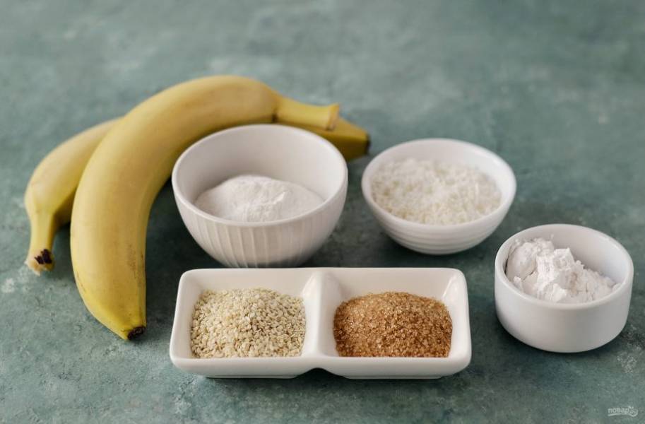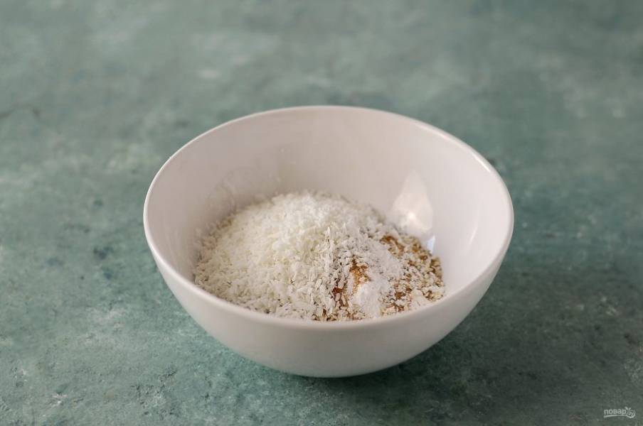 Рисовую муку смешайте с крахмалом, сахаром, солью, кунжутом и кокосовой стружкой.