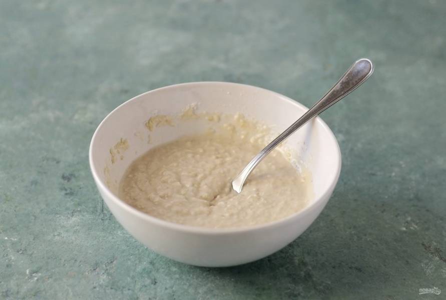 Постепенно начните вливать воду до консистенции густого и липкого теста.