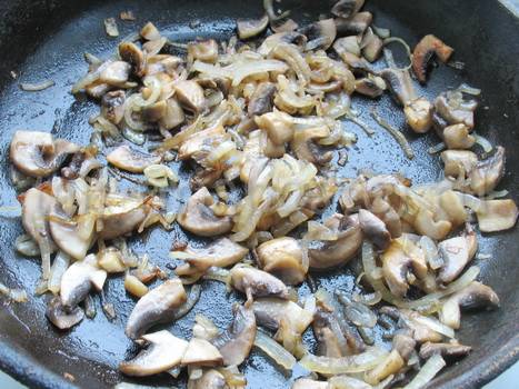 Пока бануш подходит, сделаем грибной соус. Нарезаем мелко луковицу и обжариваем на сковородке с шампиньонами. Затем тушим 15 минут и сверху добавляем ложечку сметаны.