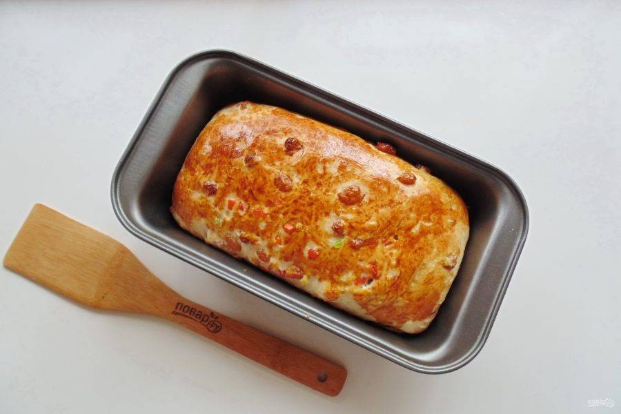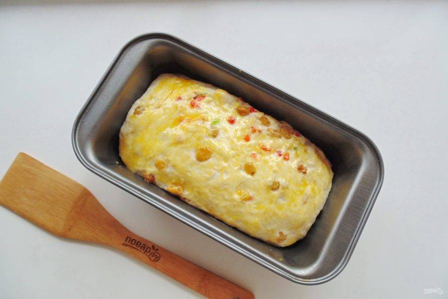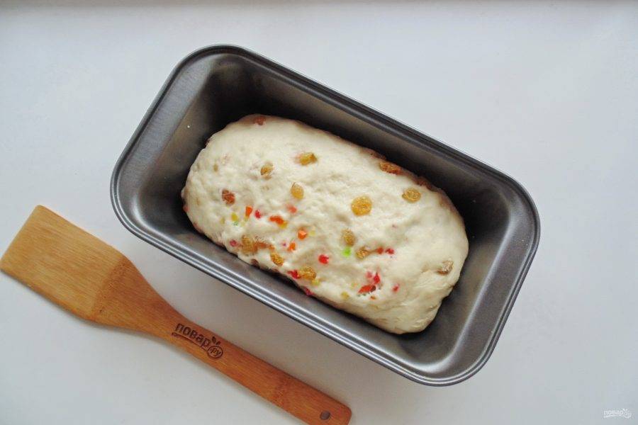 Выложите тесто в форму для хлеба, смазанную маслом. Дайте тесту постоять в тепле 25-30 минут.