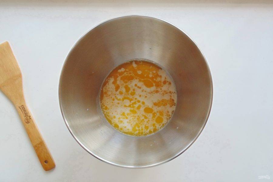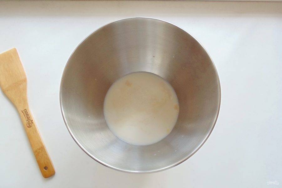 В миску налейте теплое молоко, добавьте дрожжи и столовую ложку сахара. Дайте дрожжам немного вспениться.