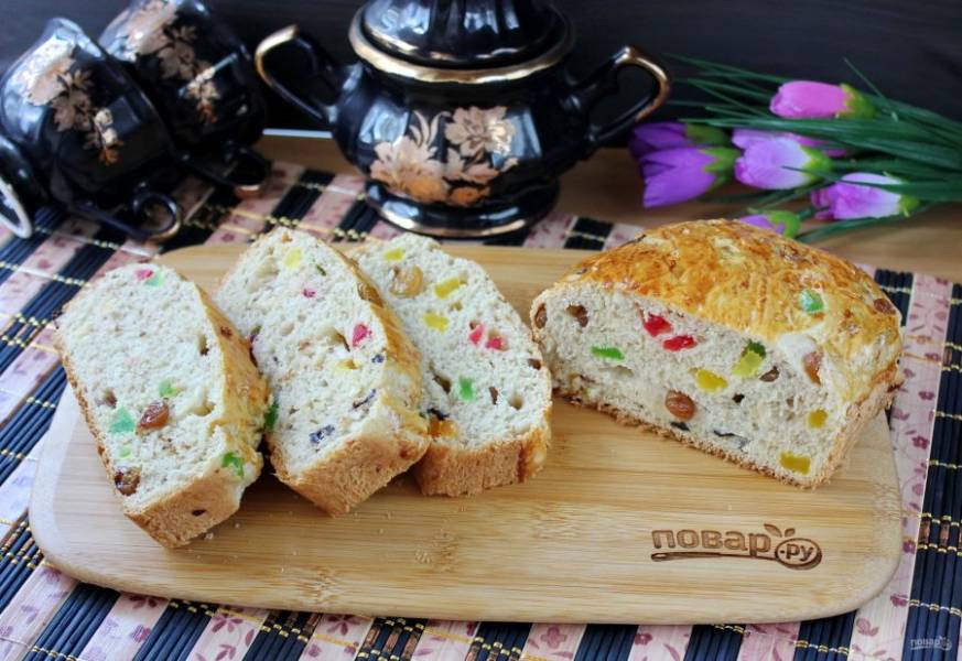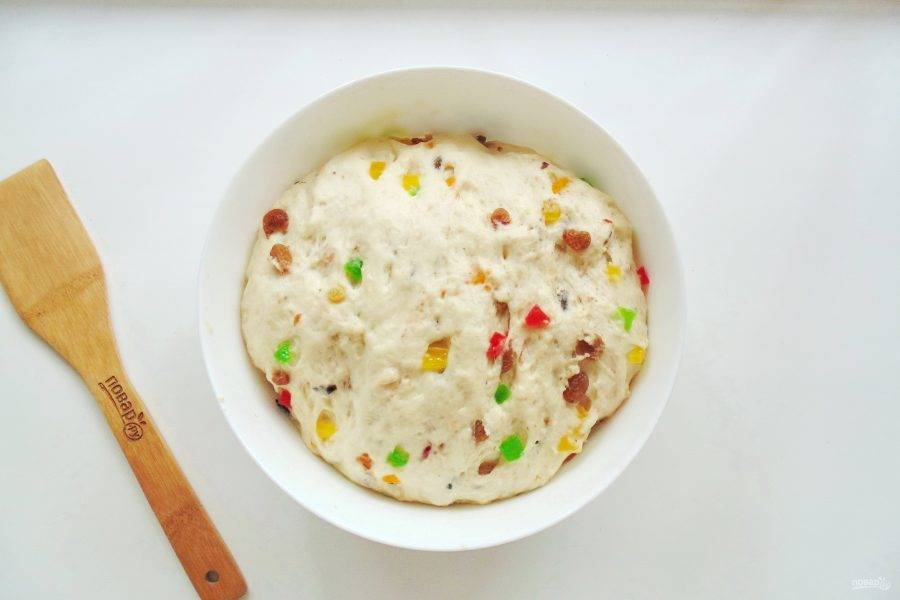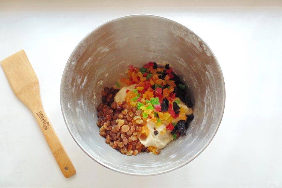Изюм помойте и залейте кипятком. Через 10 минут воду слейте. Добавьте изюм и цукаты в тесто. Хорошо перемешайте.