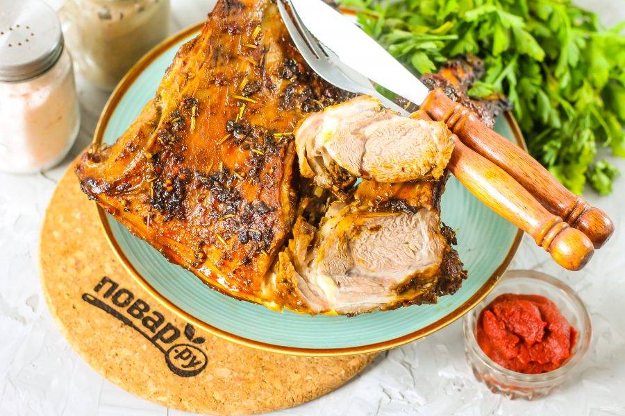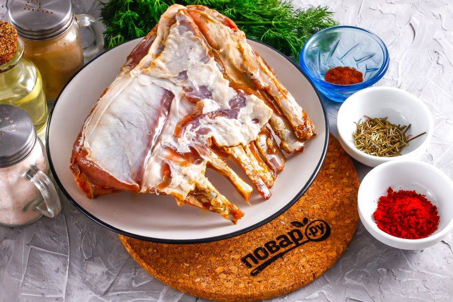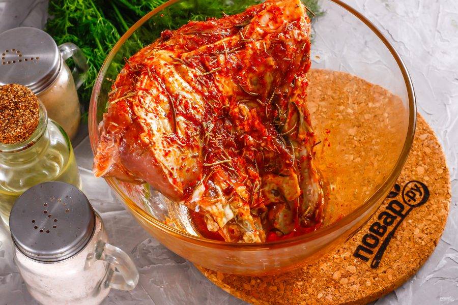 Баранину промойте в воде и очистите от жил, пленок. Обсушите бумажным полотенцем или салфеткой и полностью обмажьте подготовленным маринадом со всех сторон. Оставьте в емкости примерно на 1-2 часа для пропитывания ароматами.