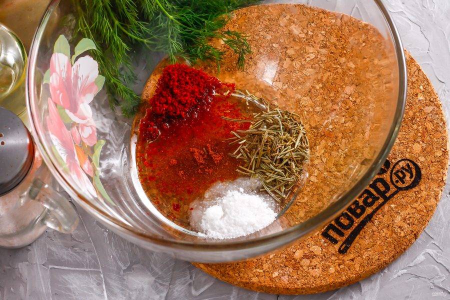 Соедините в глубокой емкости все специи и растительное масло, тщательно перемешайте. По желанию можете добавить спрессованный свежий или молотый сушеный чеснок.