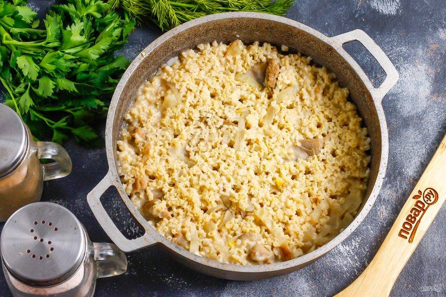 Спустя указанное время выключите нагрев, накройте емкость крышкой и оставьте еще на 10 минут, чтобы каша впитала в себя остатки жидкости, а мясо стало более нежным на вкус.