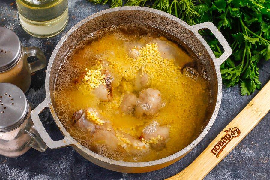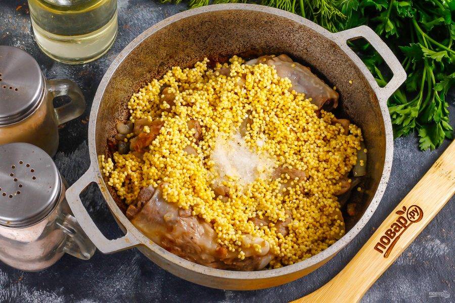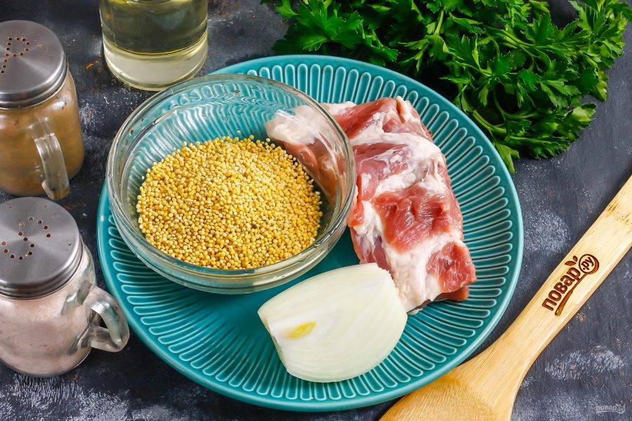 Подготовьте указанные ингредиенты. Старайтесь использовать мясо ягненка или молодую баранину, так как мясо более взрослого животного нужно после обжаривания отварить примерно 40-50 минут, чтобы оно стало мягким, и лишь потом засыпать пшено.