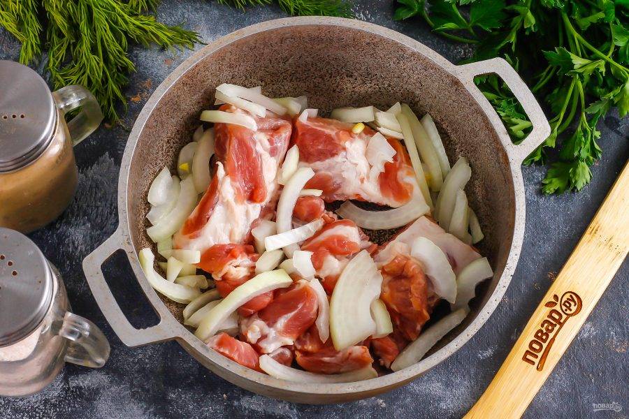 Мясо промойте в воде, нарежьте на порционные кусочки. Лучше всего использовать грудинку с ребрышками. Лук очистите от кожуры, промойте и нарежьте половину овоща полукольцами. Обжарьте мясо и луковую нарезку примерно 8-10 минут в разогретом растительном масле в казане или в сковороде с антипригарным покрытием и высокими бортиками.