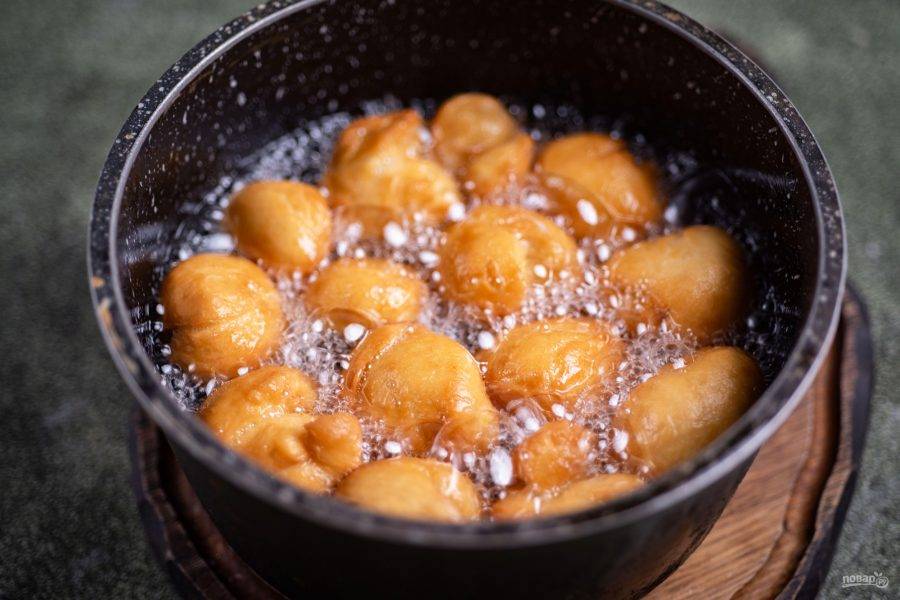 В сотейнике разогрейте на среднем огне обильное количество растительного масла и партиями выкладывайте шарики теста. Обжаривайте со всех сторон до аппетитного золотистого оттенка.