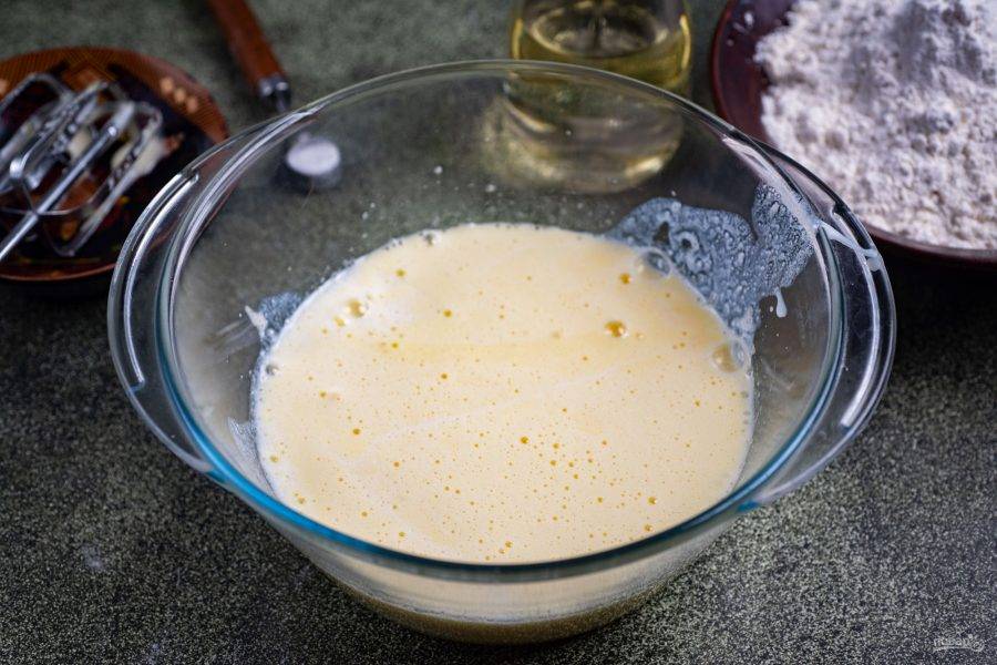 Активно взбейте эти ингредиенты миксером до получения светлой смеси.