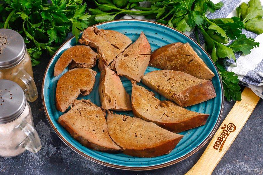 Извлеките печенку из бульона и нарежьте ее порционными ломтиками, выложите их на тарелку. Тарелку по желанию можно застелить салатными листьями.