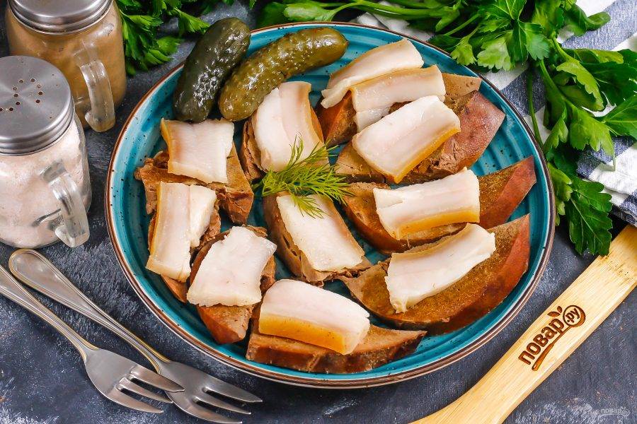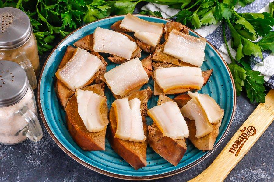Нарежьте отварное сало и выложите ломтики сала на печеночные ломтики.