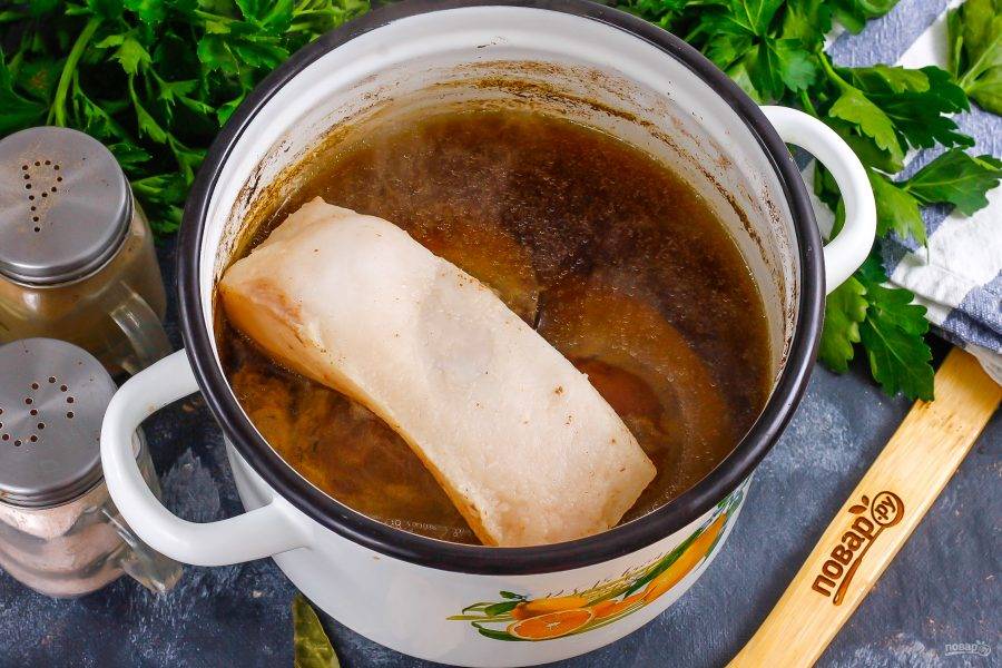 Примерно через 20 минут добавьте в кастрюлю промытое сало, соль. Отварите еще 5 минут до готовности. Печень пробейте ножом в самом широком месте, чтобы она проварилась и внутри.