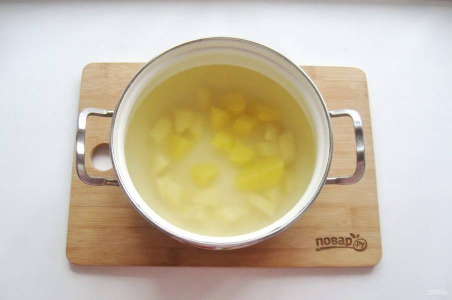 В кастрюлю налейте любой мясной бульон или воду. Картофель очистите, помойте, нарежьте кубиками и выложите в кастрюлю с бульоном.