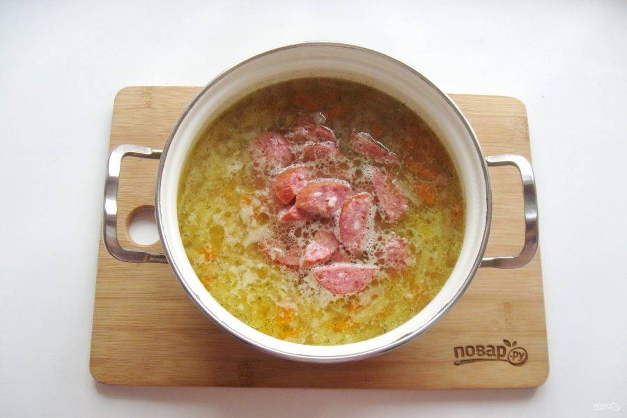 Копченые колбаски нарежьте и добавьте в готовый суп.