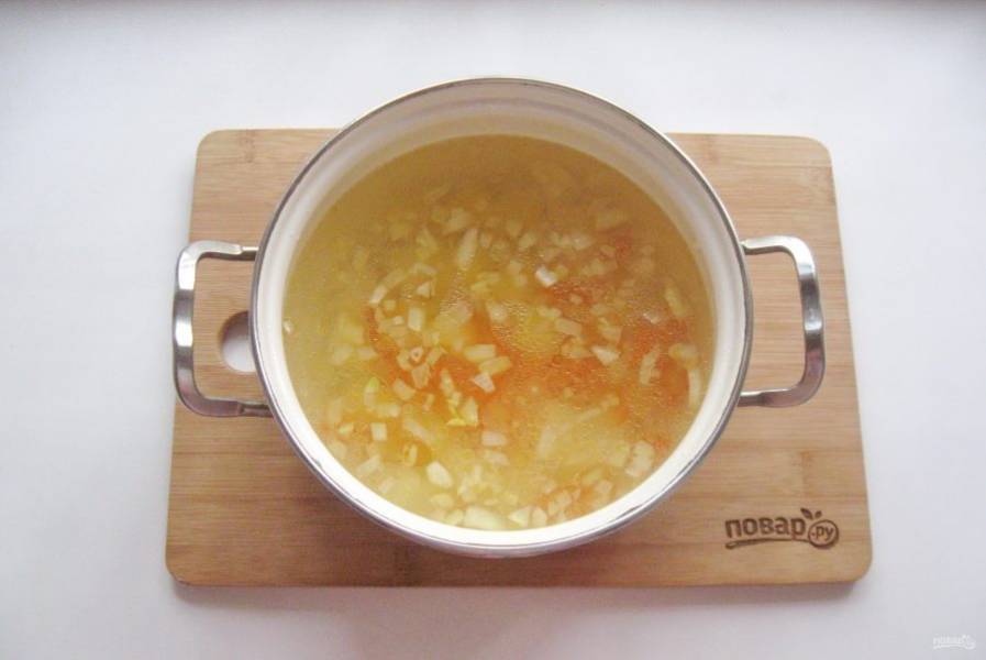 Добавьте лук с морковью в суп и продолжайте его варить.
