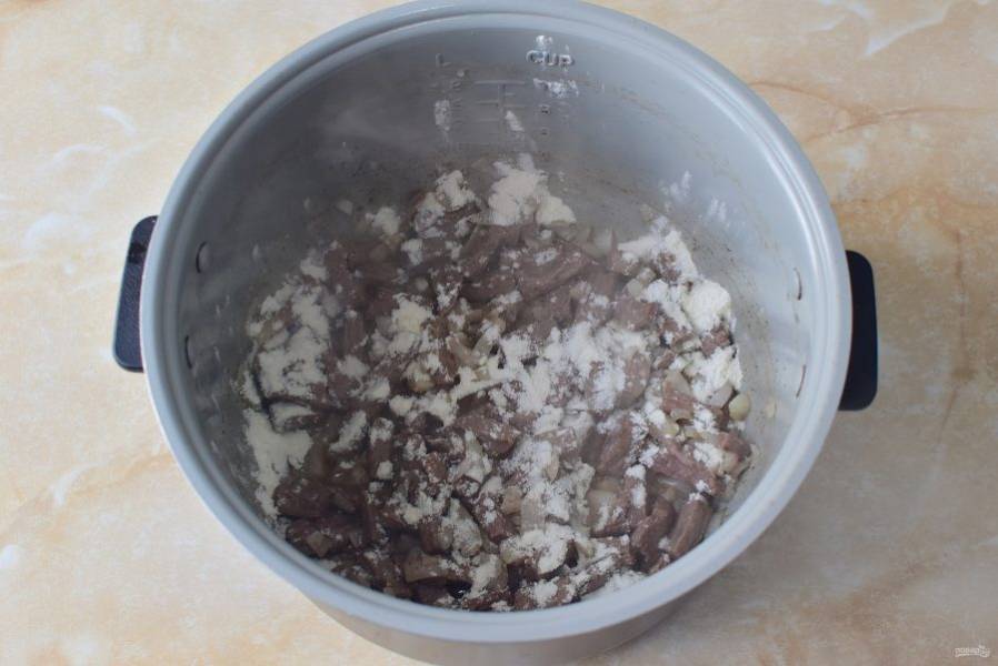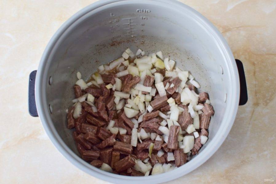 Включите мультиварку на режим "Жарка" и разогрейте чашу до горячего состояния. Налейте в чашу растительное масло и выложите мясо. Обжаривайте мясо с открытой крышкой 3-5 минут, чтобы оно поменяло цвет.