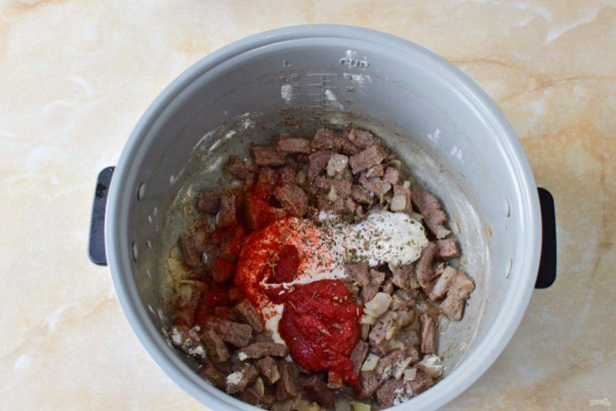 Теперь добавьте в чашу сметану и томатную пасту. Подсыпьте соль и специи.