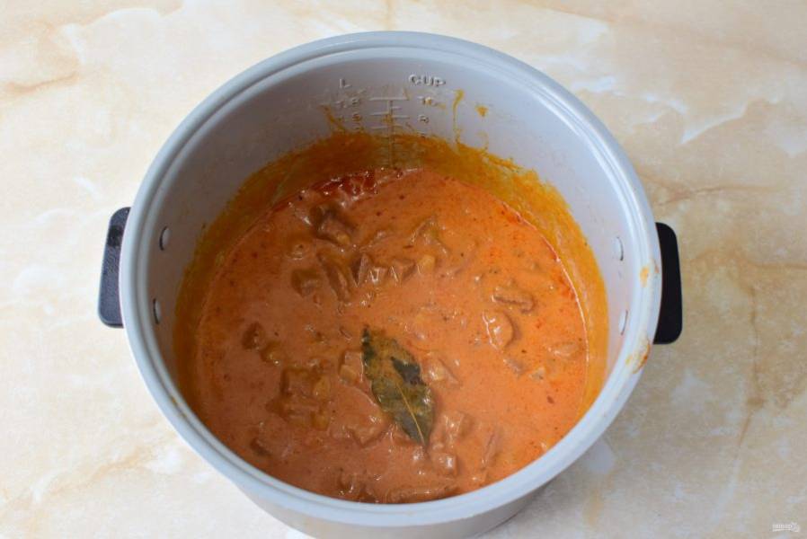 За 5 минут до окончания приготовления добавьте в чашу лавровый лист.