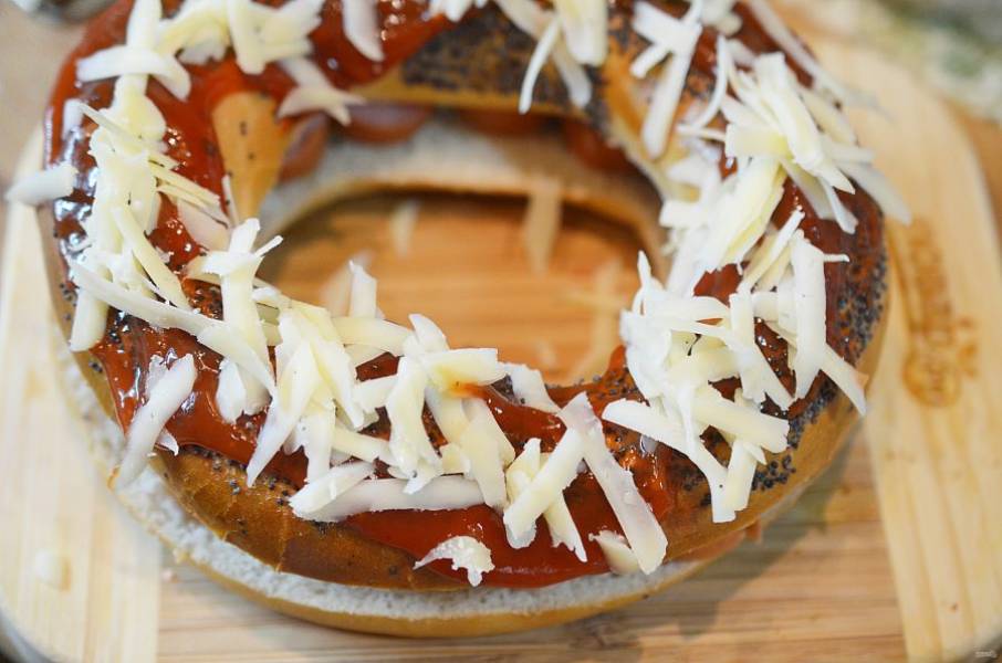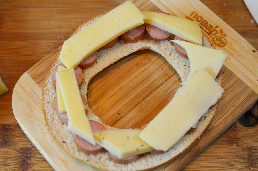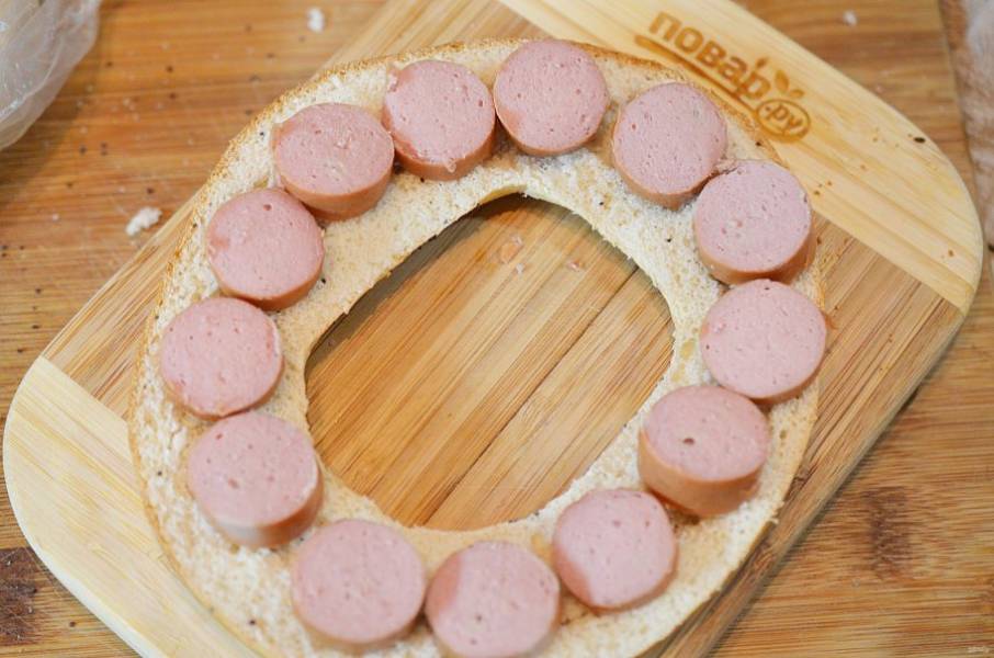 Выложите на одну половину бейгла нарезанную кружками колбаску.