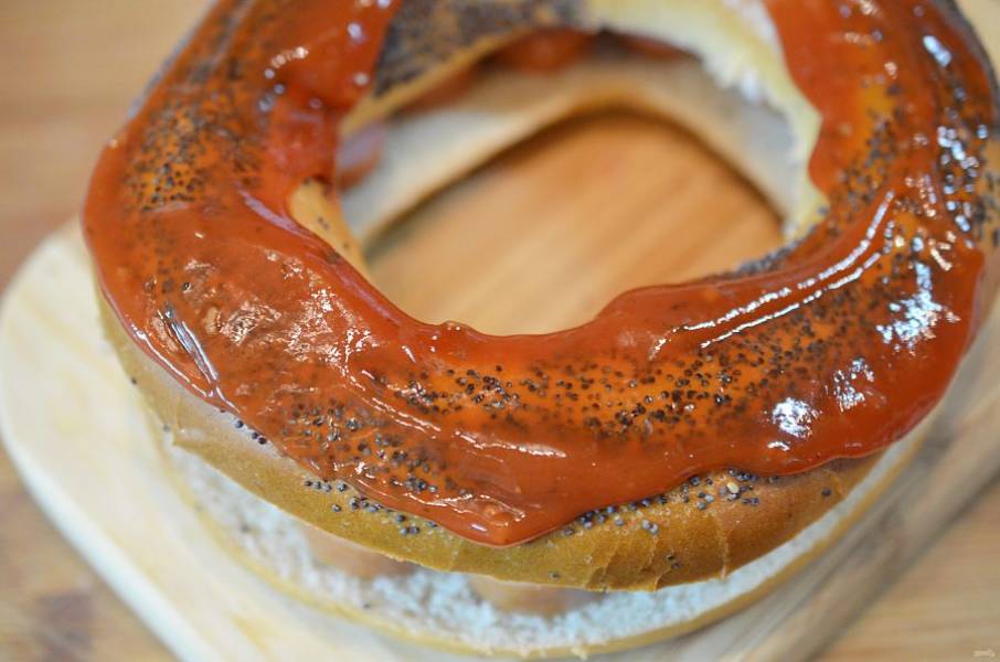 Накройте верхней частью бейгла и смажьте томатным соусом.