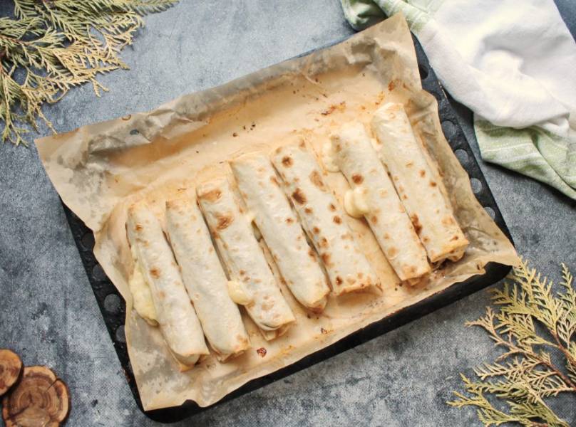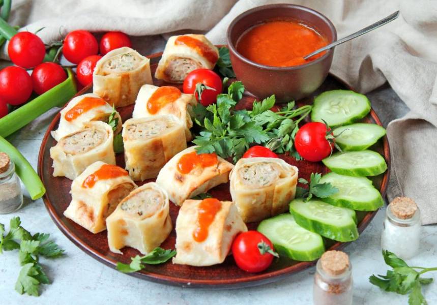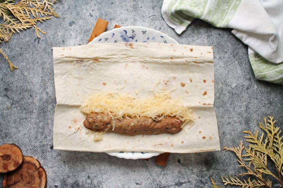 Тонкий лаваш разрежьте на кусочки немного длинее кебаба и шире, чтобы можно было завернуть. На один край каждого лаваша положите кебаб, посыпьте тертым на средней терке сыром и заверните в рулетики, подвернув бока.