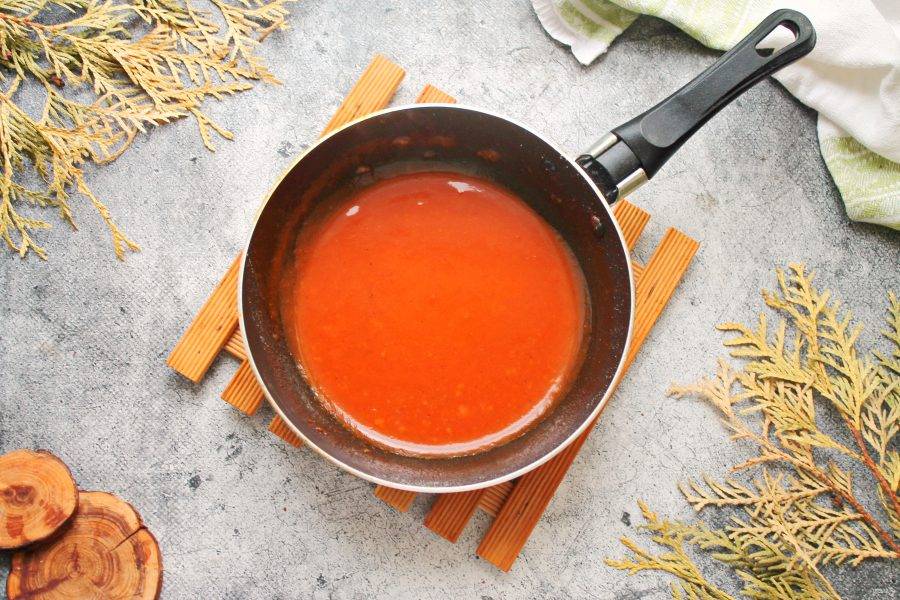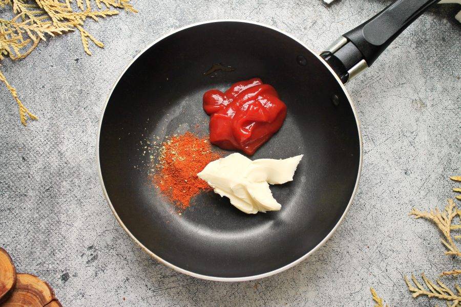 Пока шашлык готовится приготовьте соус. В сковороду выложите сливочное масло, томатную пасту, специи и перец. Поставьте на медленный огонь и после того как масло растает, перемешайте до однородности. Обжаривайте массу в течение 3 минут, перемешивая.